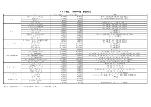 当サロンではお客様に安心してご利用いただけるよう、スタッフの技術向上と価格の維持に勤めて参りましたが、光熱費や薬剤原料の高騰に伴って、誠に心苦しいのですが、2026年4月1日より一部メニューの料金を改定させていただくこととなりました。
